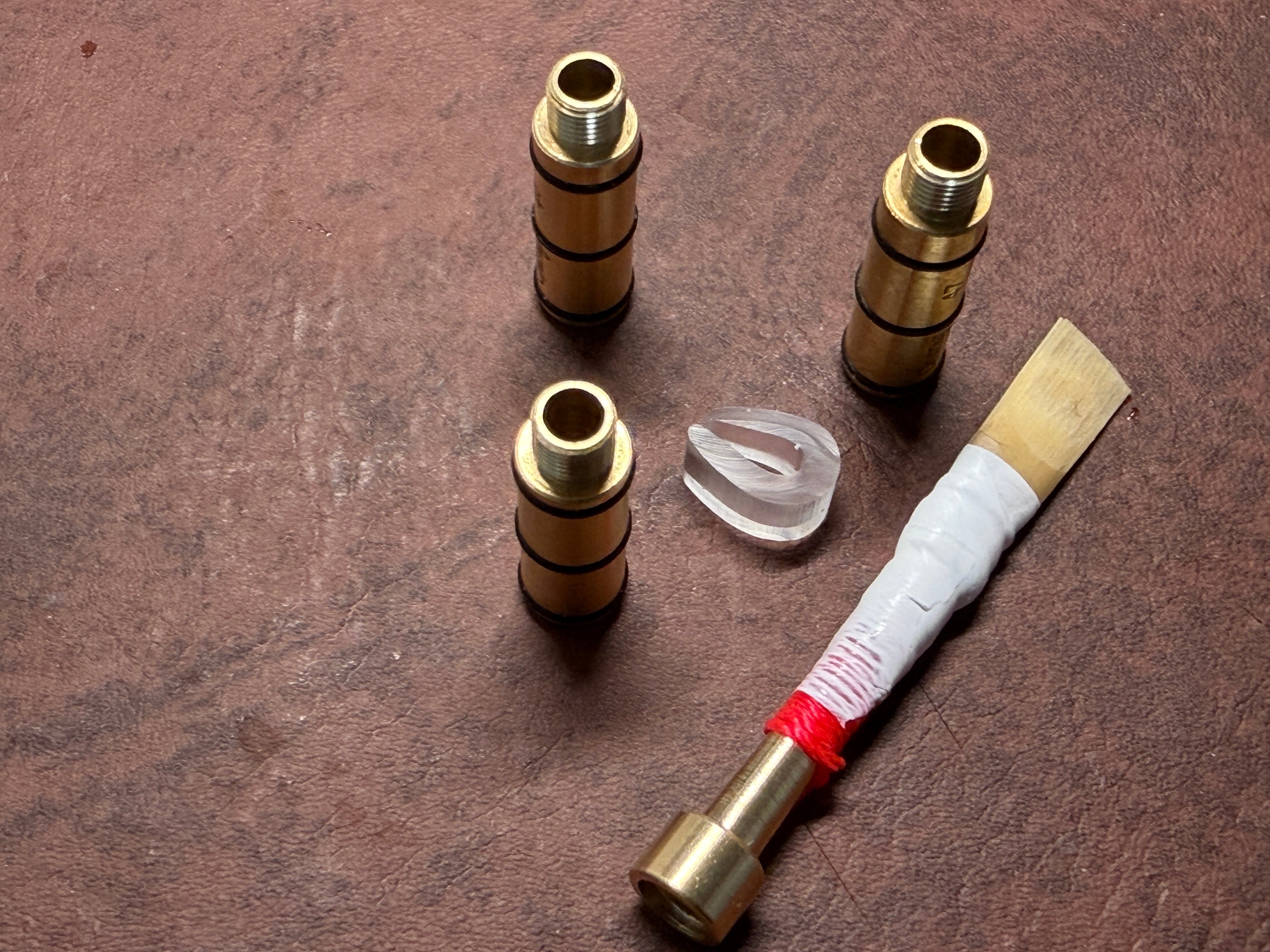 ※46ミリチューブを基本に製作しており(全長68mm)、それで音程が高い場合は、下のチューブを47ミリに変えてください。音程が下がります。少し優しい音にも感じます。オーケストラ1番奏者や吹奏楽に向いていると思います。